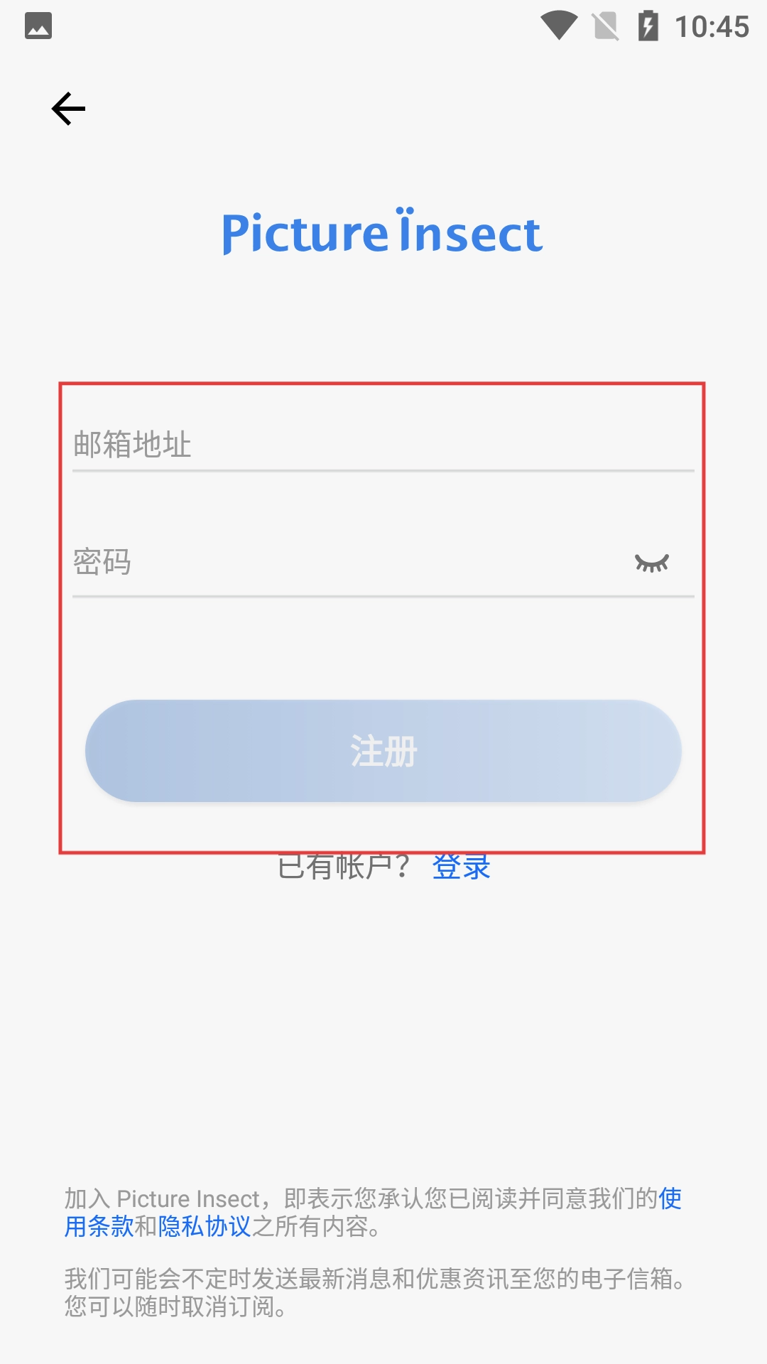 3、进行注册操作时,需要按顺序填写【邮箱地址】与【密码】,填写完毕后点击【注册】按钮,就能完成账号注册流程。