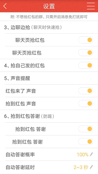 开启抢红包答谢功能,还可以设置答谢延迟的时间;