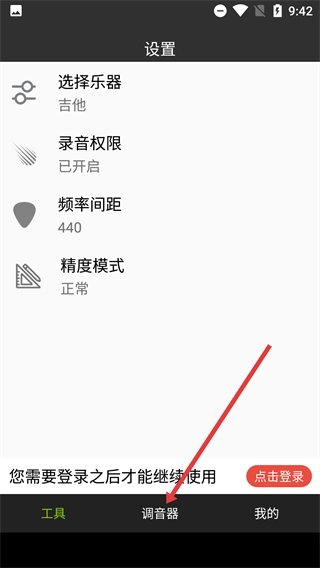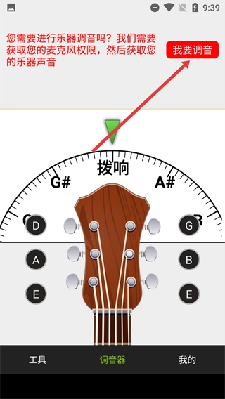 4、进入调音器页面后,点击【我要调音】按钮,就能启动吉他调音流程。