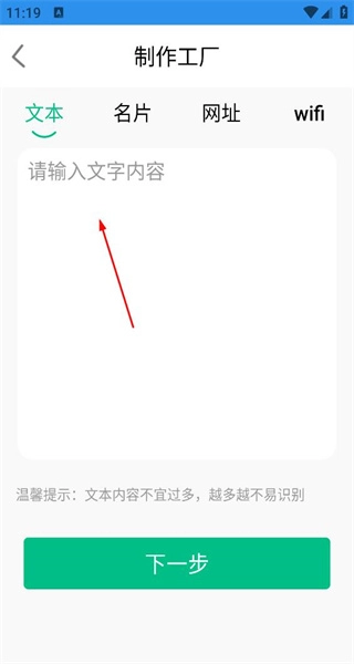 1、启动软件后,进入文本界面,在输入框中填写文字内容,阅读温馨提示后点击下一步按钮。