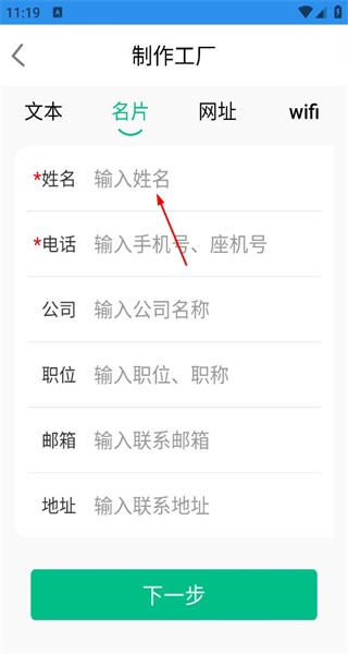 2、切换至名片页面,填写姓名、电话等必填信息,补充其他可选内容后,点击下一步按钮。