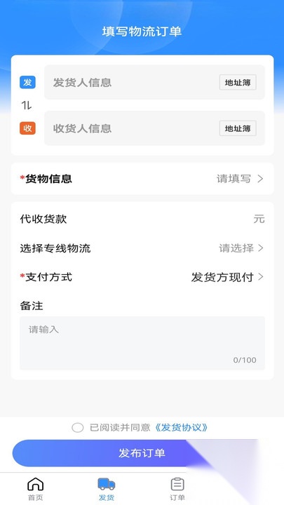 3、用户可便捷发布物流订单,详细填写货物信息、收发地址等内容,还能实时查看订单状态,从接单、运输到签收的全流程都清晰可见。