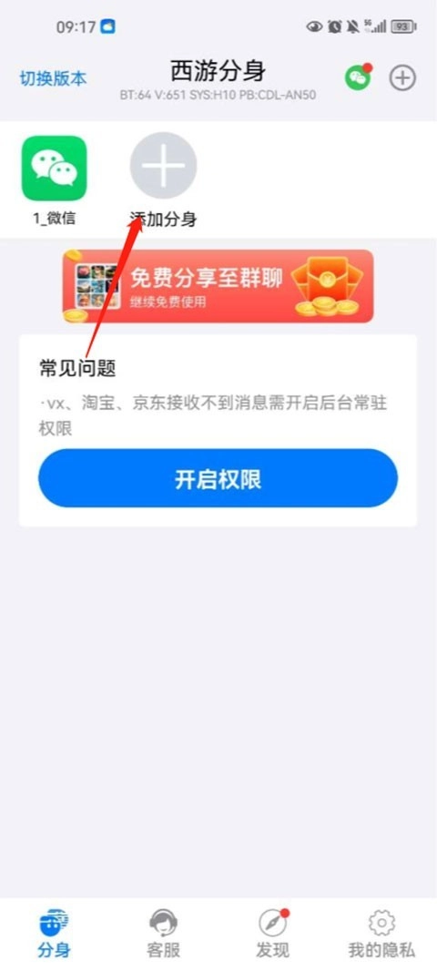 1、在本站打开西游分身后,在首页点击添加分身。