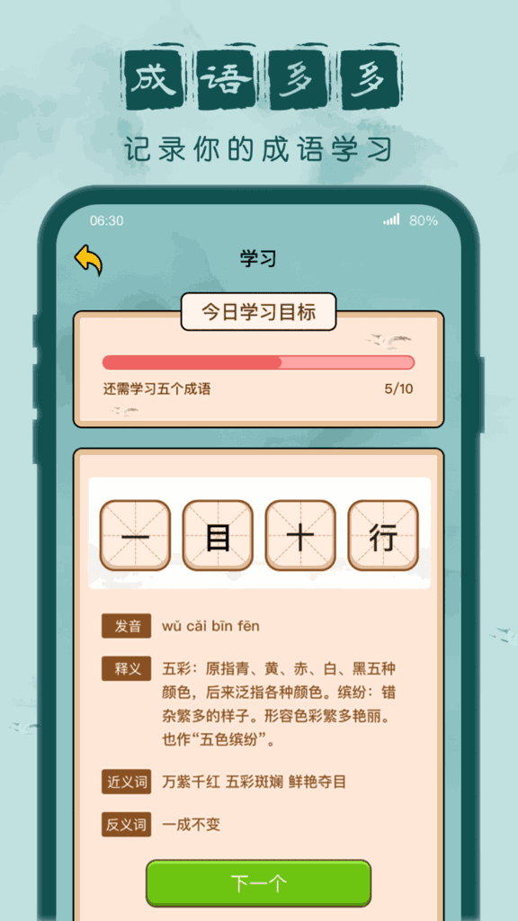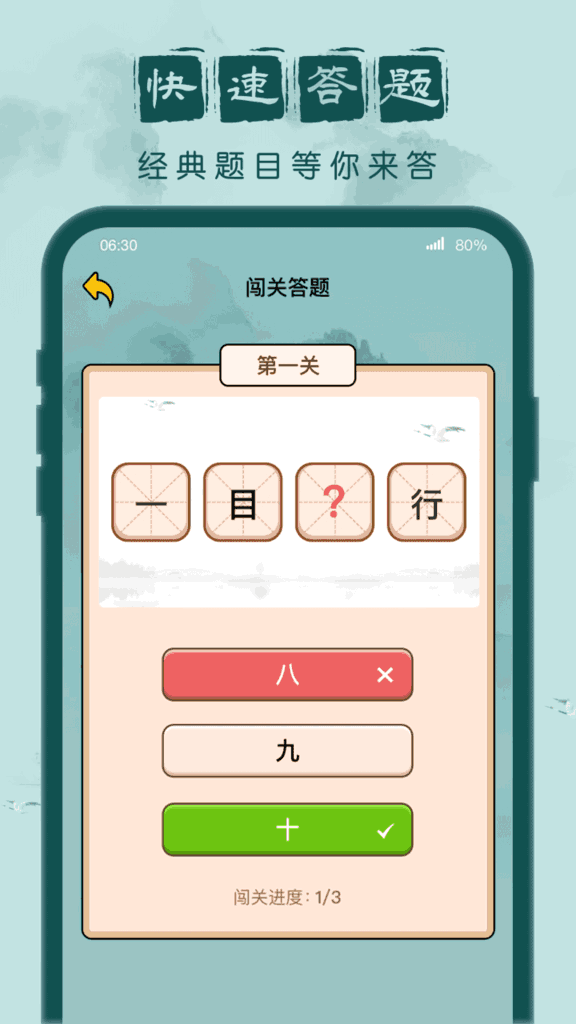 1这款以成语为核心的趣味闯关应用,了海量的成语资源库,不同关卡对应着梯度化的题目难度设计,能够适配从入门到进阶的各类学习者,让不同水平的用户都能找到适合自己的学习节奏与挑战目标。