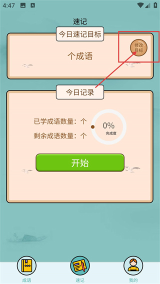 3、在速记页面,点击“修改目标”按钮,能够调整当日需要速记的成语数量。