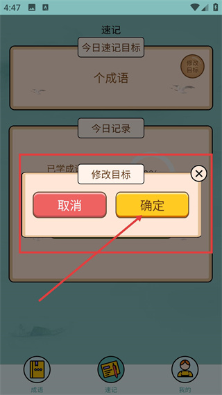 4、在修改目标的弹窗里,确认好调整后的目标数量后,点击“确定”按钮,即可完成今日速记目标的设置。