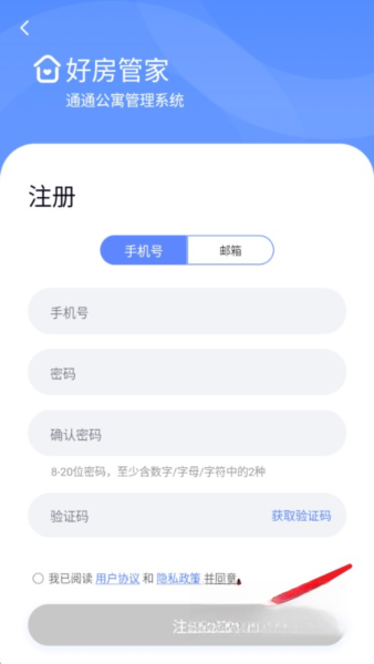 1首先启动好房管家应用程序,接着在登录界面输入已有的手机号码与对应的密码完成登录操作;若还未注册账号,则可以点击界面上的注册选项来创建新的账号。