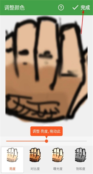3、进入调整颜色的页面,拖动滑块来调整图片的亮度参数,等设置到合适的程度后,点击完成按钮继续推进流程。