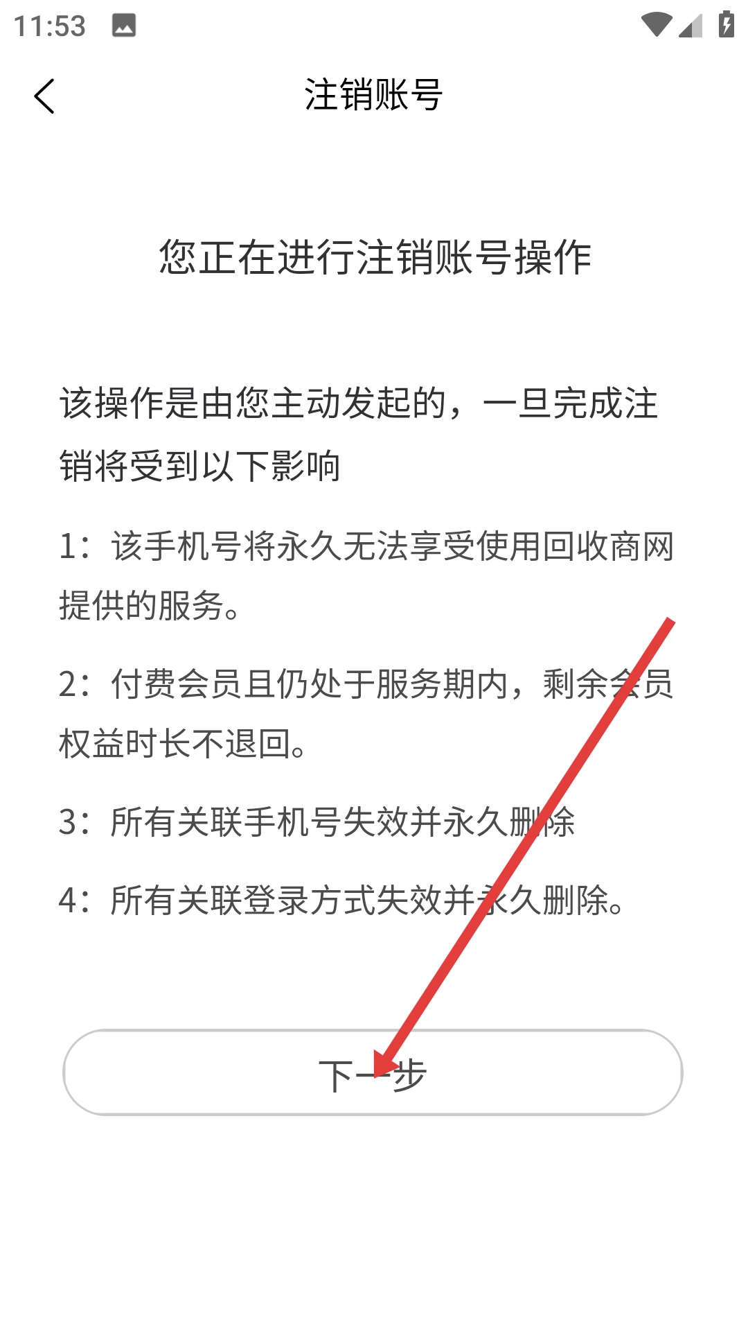 4、在账号注销说明页面中点击【下一步】按钮,以继续推进账号注销流程的完成。