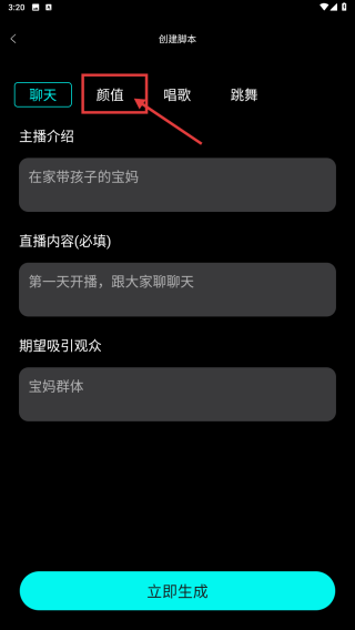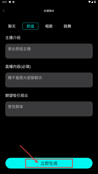 3、把信息都填写好之后,点击“立即生成”按钮,就能生成颜值类的直播脚本了。