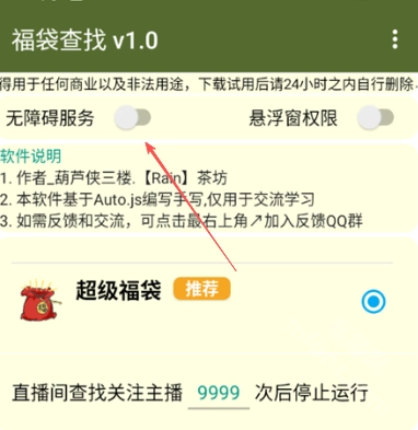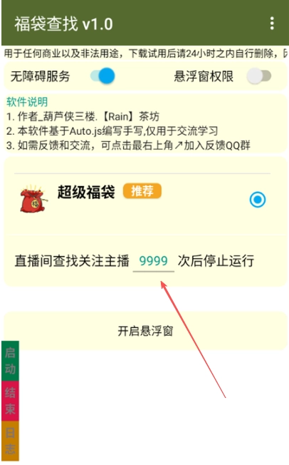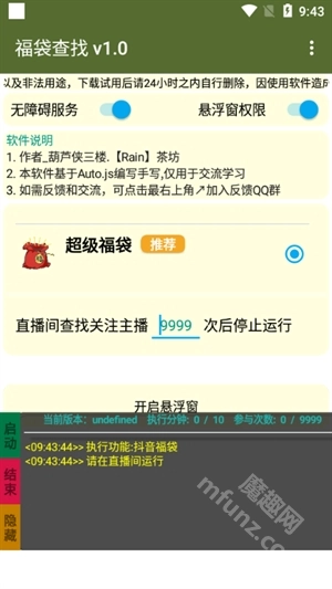 福袋查找是一款能让你彻底解放双手的抖音直播间自动抢福袋脚本。虽然它的界面看起来比较简单,但实际使用效果相当不错。使用这款福袋查找器需要先授予无障碍服务和悬浮窗权限,开启后你可以手动设置点击次数,之后它就能自动检测并领取直播间里的福袋了!