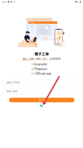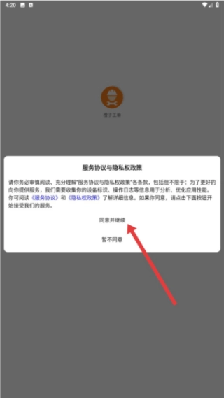 1. 开启橙子工单应用程序,在弹出的服务协议与隐私权政策界面,需认真查看相关条款内容。若确认无误,点击“同意并继续”按键,即可进入登录界面。
