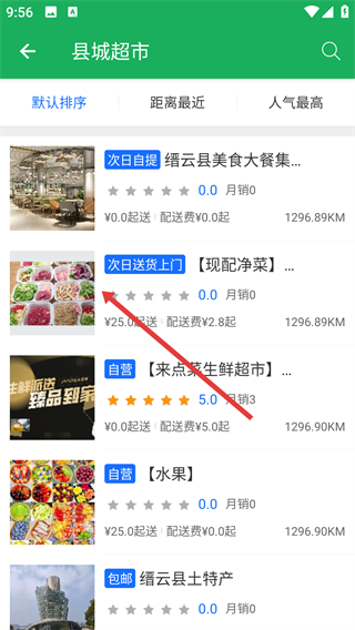 3、在县城超市列表里点击【现配净菜】店铺,即可进入该店铺页面。