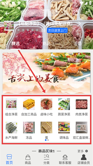 4、在店铺页面里挑选你需要的商品分类,像组合净菜、水产海鲜这类,就能查看对应的商品了。