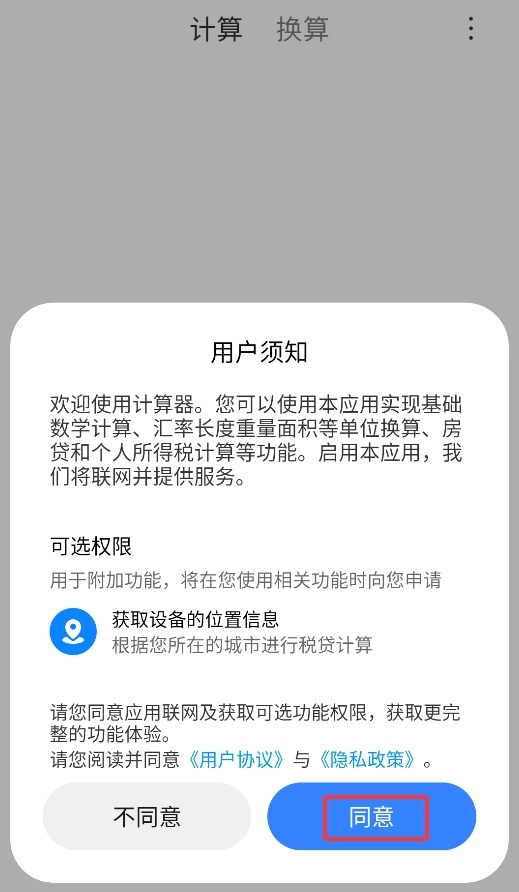 1、首次打开应用时,请点击弹窗里的同意选项,这样才能进入主界面开始使用。
