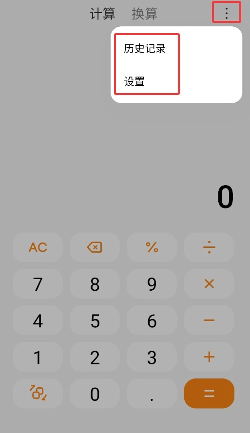 2、在计算器页面的右上角,点击菜单图标,就能查看历史记录或者进入设置选项。