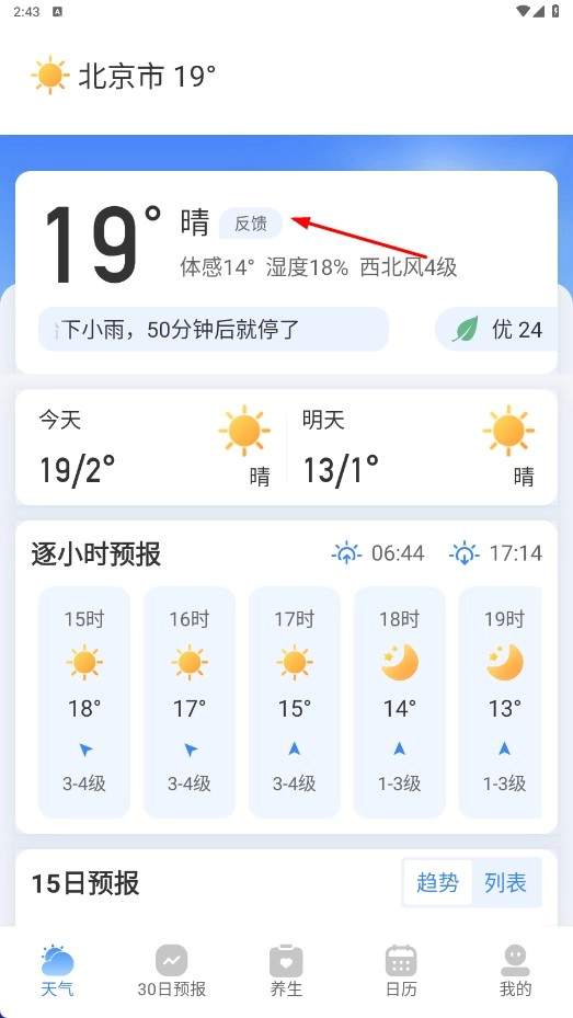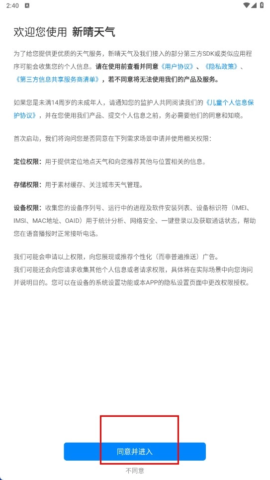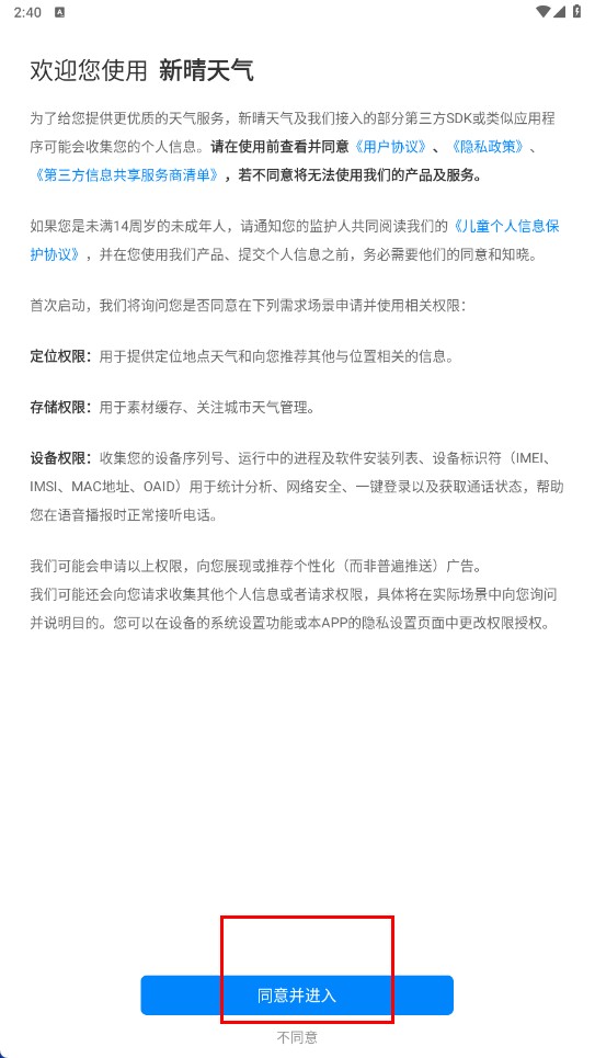 1、点击【同意并进入】功能按钮,即可进入新晴天气的主页面。