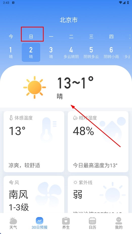4、点击具体日期(例如“日”),就能查看该日期的详细天气情况,涵盖体感温度、相对湿度、风力大小、紫外线强度等信息。