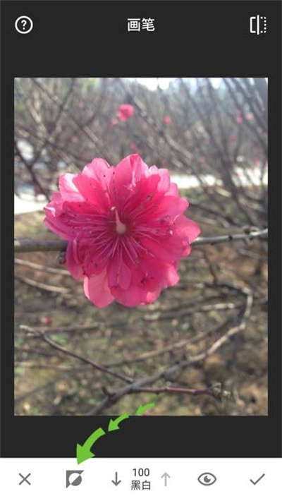 4、点击右下角的画笔图标后,画面会切换成全黑蒙版状态。把图像放大,用手指在想要呈现彩色的区域进行涂抹,就能达成局部上色或是双色调的视觉效果。