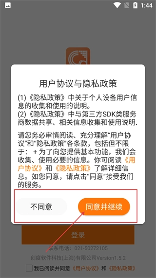 1、在弹出的【用户协议与隐私政策】界面,点击【同意并继续】按钮,以继续使用软件。