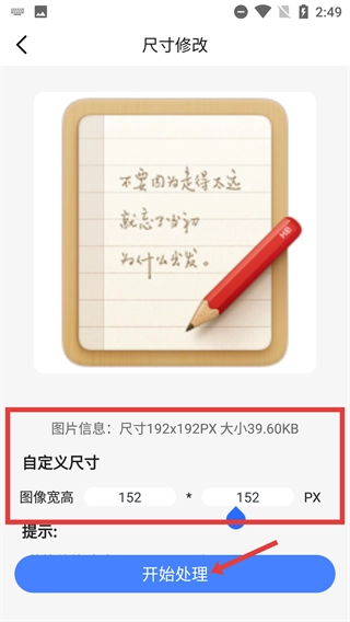 4、在【自定义尺寸】区域设置图像宽高(如示例中的152x152PX),点击【开始处理】,完成图片尺寸修改操作。