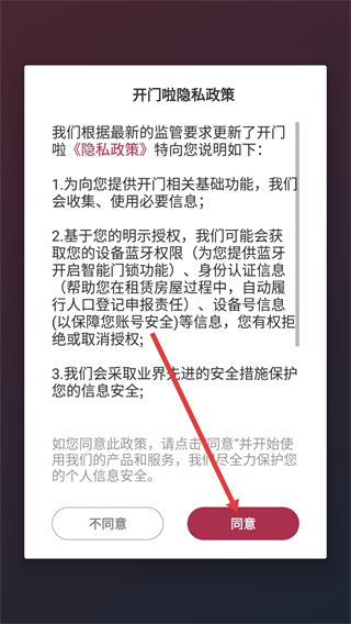 在【开门啦隐私政策】弹窗里,需要仔细阅读后点击【同意】按钮,才能继续使用这款应用。