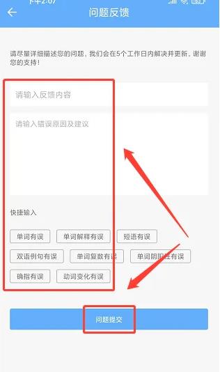 3. 进入问题反馈页面,填写反馈内容、反馈原因并选择问题类型,随后点击【问题提交】按钮