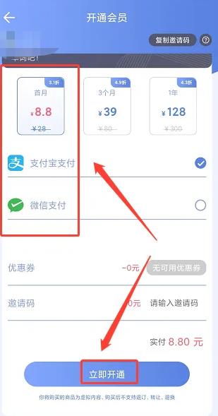 3接下来进入会员开通页面,挑选合适的会员套餐与支付渠道,最后点击开通按钮完成操作。