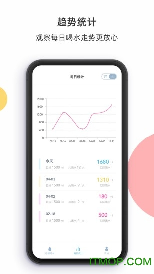 趋势统计 - 无需担心每日饮水趋势的观察问题,我们提供趋势图等两种呈现形式,助力您更有效地制定饮水计划并清晰展示您的饮水记录