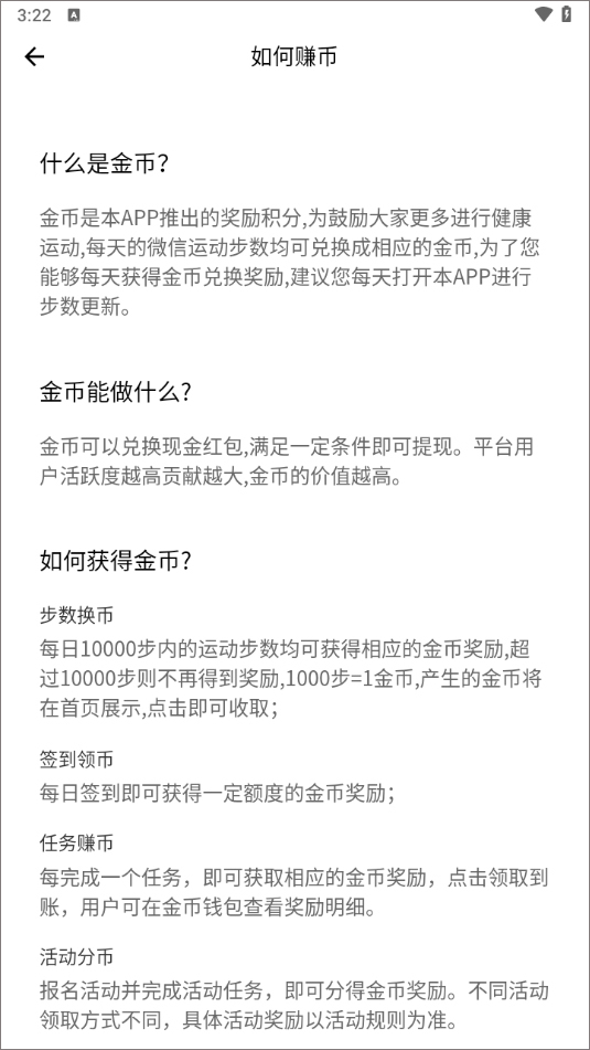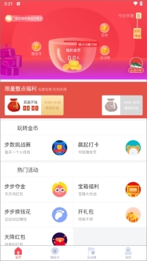 最新版本新增了赚金币板块,这里每天都有三项任务待你完成:每日分享一次链接可完成一项任务,每日早起打卡能完成另一项任务,最后一项任务是每日累计行走5000步。完成这三项任务后均可获得金币奖励,金币可兑换现金并提现至微信或支付宝,我们致力于为你提供最舒适的使用体验。快来步步赚钱体验吧!