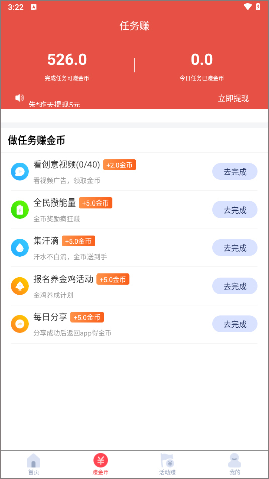 2、点击赚金币界面,做任务获得金币就可以赚钱了~