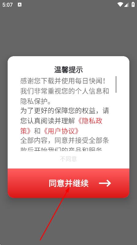 1、在温馨提示弹窗里,点击“同意并继续”按钮,即可进入每日快闻的主页面。
