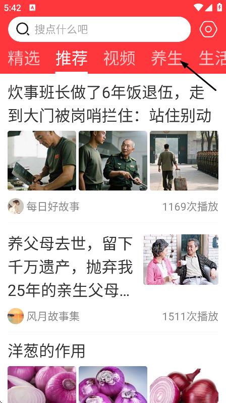 2、进入每日快闻主页面后,点击“养生”选项,即可切换至养生类内容页面。