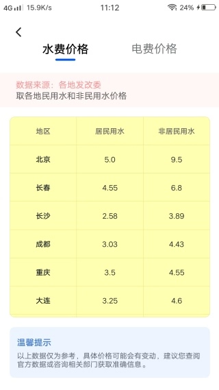 4、各地水电价格轻松一览,实时进行更新。