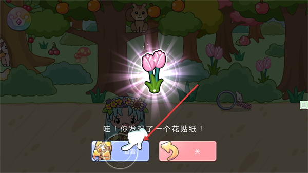 4、进入贴纸收集页面,找到并查看已获取的粉色郁金香贴纸,完成收集流程。
