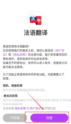 1、点击同意按钮,以便顺利进入应用程序,开启你的学习与翻译之旅。
