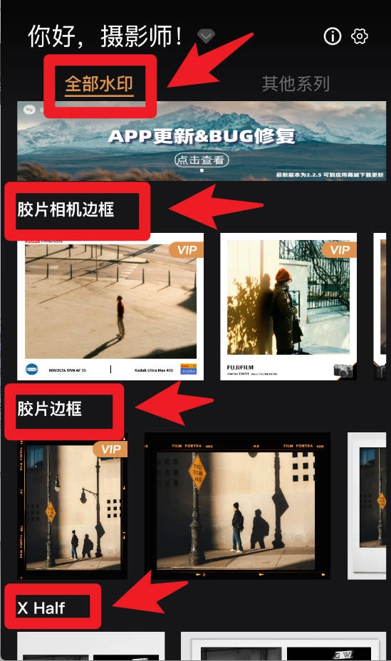 2、首页可在全部水印分类中浏览各类相机边框和特效样式,点击即可预览效果。