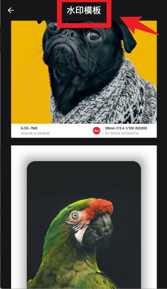 4、进入水印模板页面,可直接查看并应用多种风格的水印样式到照片中。