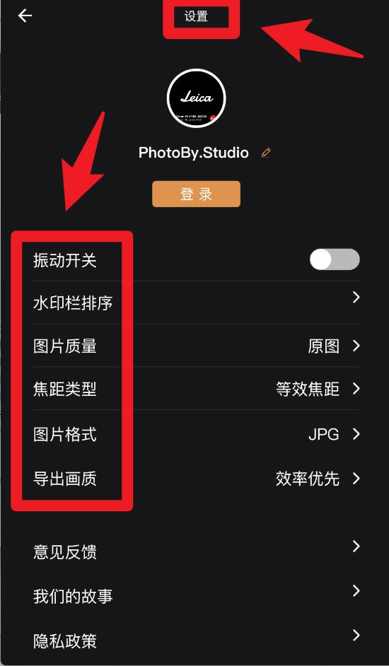 5、点选齿轮符号可进入设置,页面中可调整水印栏排序、图片质量、焦距类型、格式及导出画质等参数。