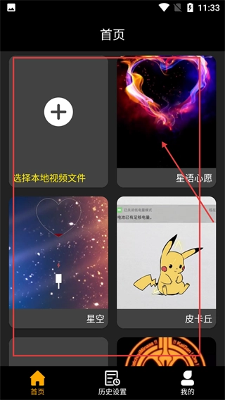 在首页界面,用户可以选择“选择本地视频文件”选项,也可以挑选系统预设的动画,像“星语心愿”“星空”“皮卡丘”等,本次操作选择的是“星语心愿”动画。
