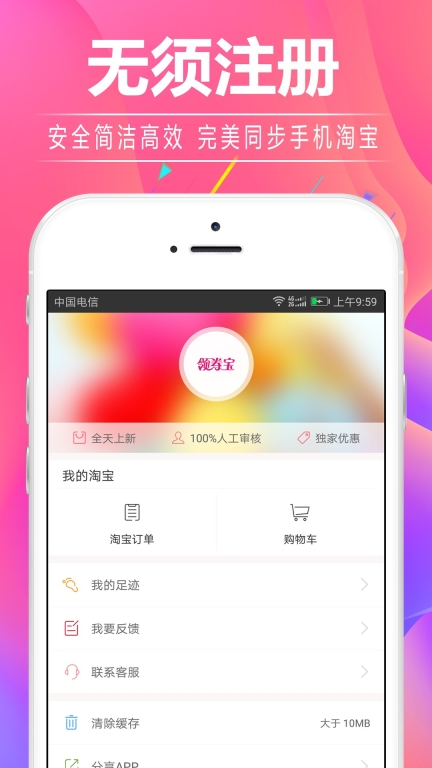 2、领券宝和手机淘宝能无缝衔接,安全可靠且无需注册,在后台领取到所需的宝贝优惠券后会自动跳转至手机淘宝完成下单操作。