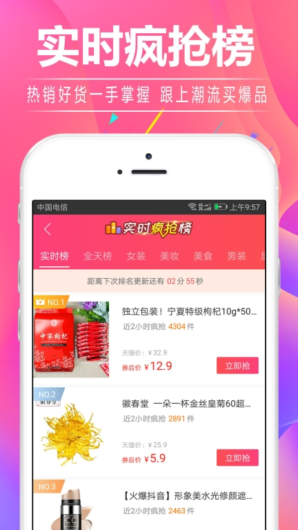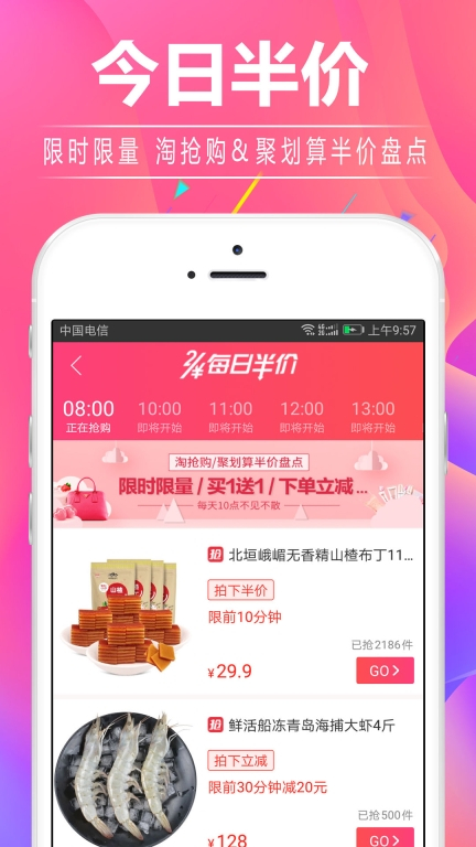 4、领券宝的特色包括:9.9元/19.9元商品包邮、聚划算与淘抢购平台每日推出半价活动、疯抢商品排行、今日新品上架、新品上架预告、咚咚抢活动以及小编的特色推荐。