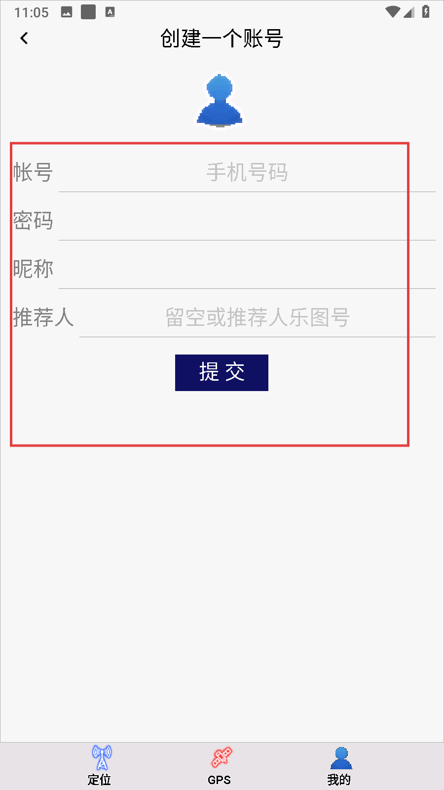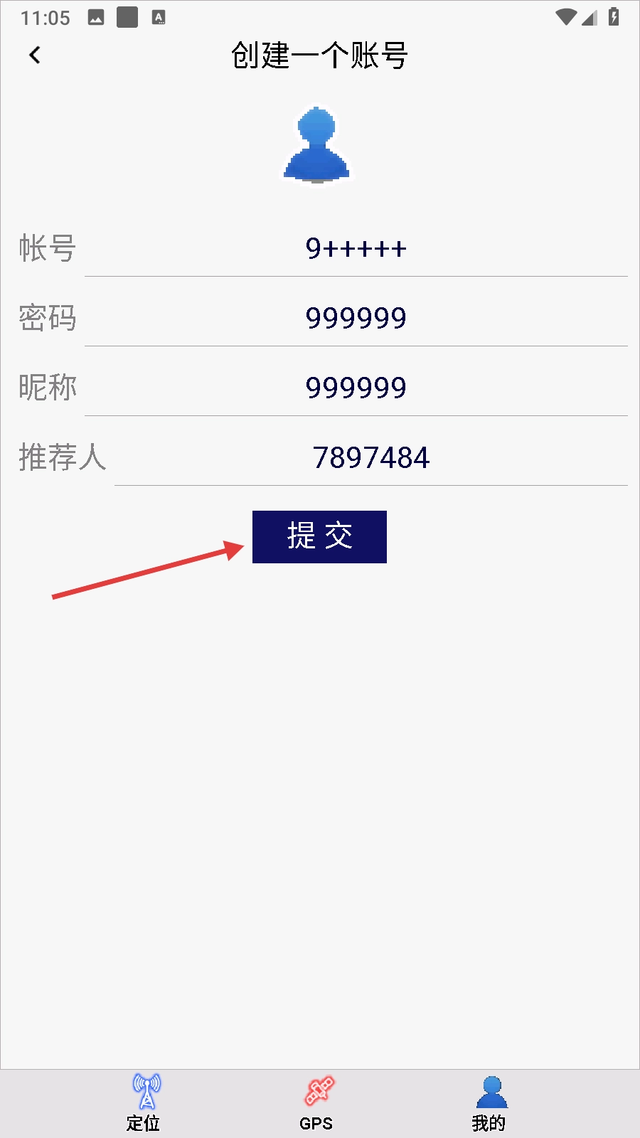 4、在创建账号页面,填写好手机号码、密码、昵称和推荐人信息后,点击【提交】按钮即可完成注册。
