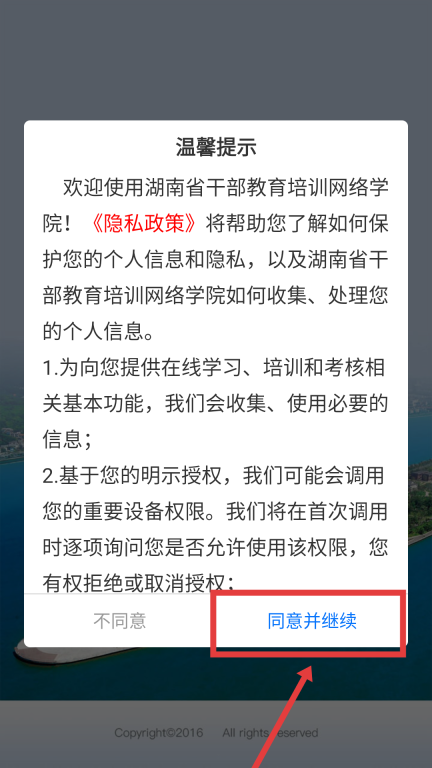 1、在湖南省干部教育培训网络学院弹出的【温馨提示】窗口里,点击【同意并继续】按钮,即可进入后续操作环节。