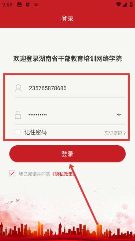 2、进入登录界面后,输入账号与密码,勾选同意《隐私政策》,再点击【登录】按钮。