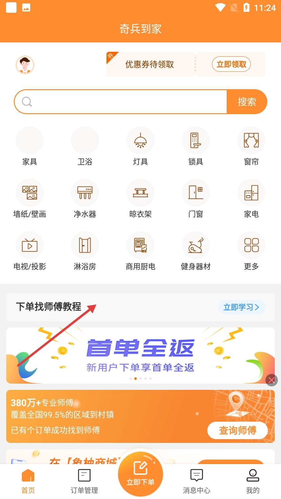 4、注册成功进入首页可查看家具、卫浴等各类服务分类,还可学习【下单找师傅教程】,方便快捷下单找师傅。