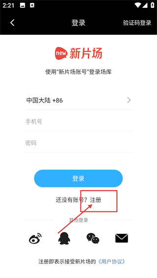 在登录页面,用户既可以使用【新片场账号】的手机号加密码进行登录,也能够选择【注册】或者【其他登录】的方式。