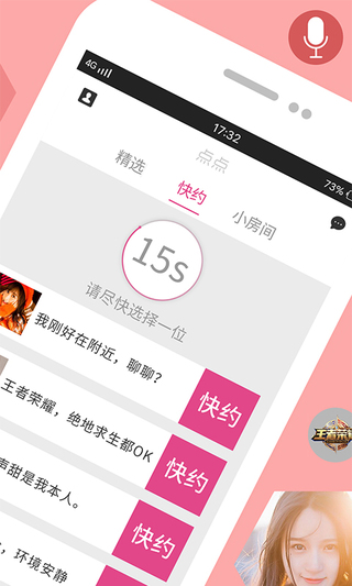 点点语音为用户提供高品质的语音聊天服务,用户只需拿起手机就能在线进行聊天交友,此外还能和美女主播一同组队开黑玩游戏。