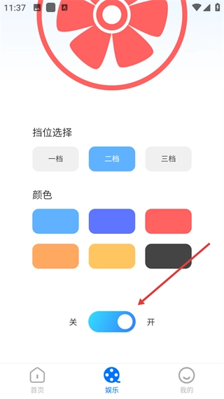 4、将开关切换至【开】,启动风扇模拟器。