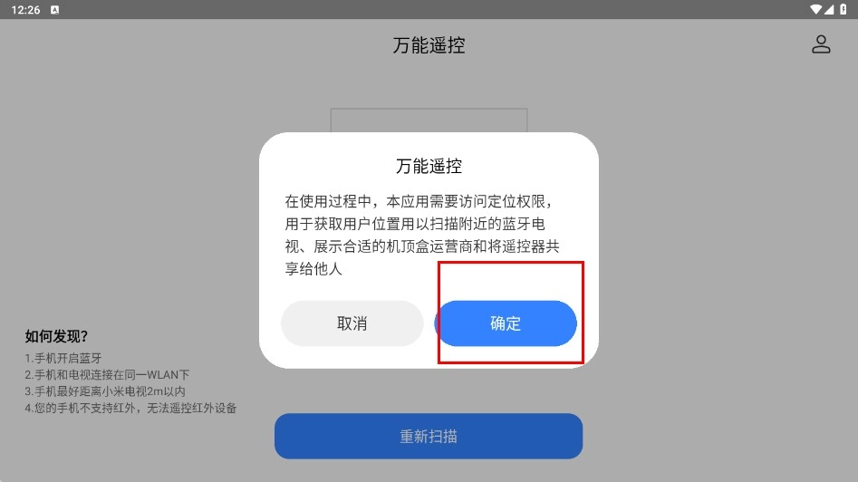 1、点击【确定-功能按钮】,同意万能遥控的定位权限申请。